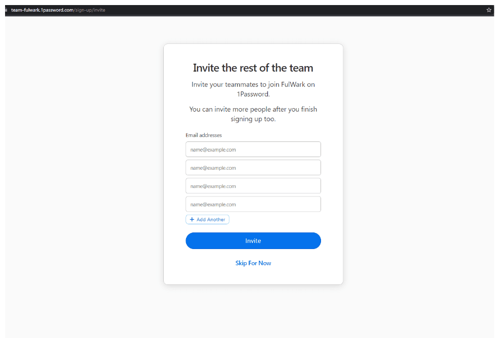 We highly recommend to read through the onboarding your team guide provided by 1password, but we’ll guide you through the basic steps to invite your team either way.
